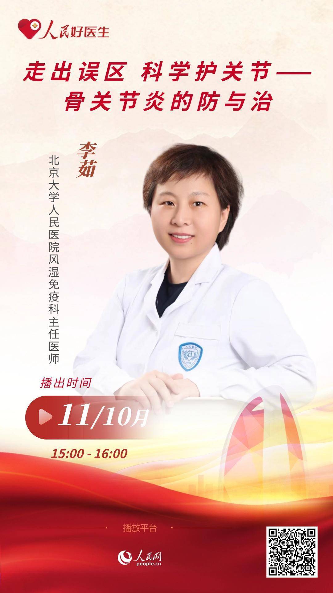 10月11日15:00,北京大学人民医院风湿免疫科教授李茹做客“人民好医生”科普直播间,从骨关节炎的基础生活管理到手术干预等核心话题进行系统讲解,为您带来权威、实用的关节健康指南,助您迈出健康每一步。
